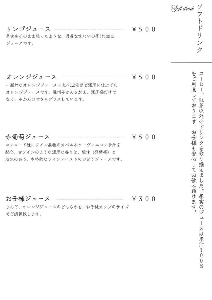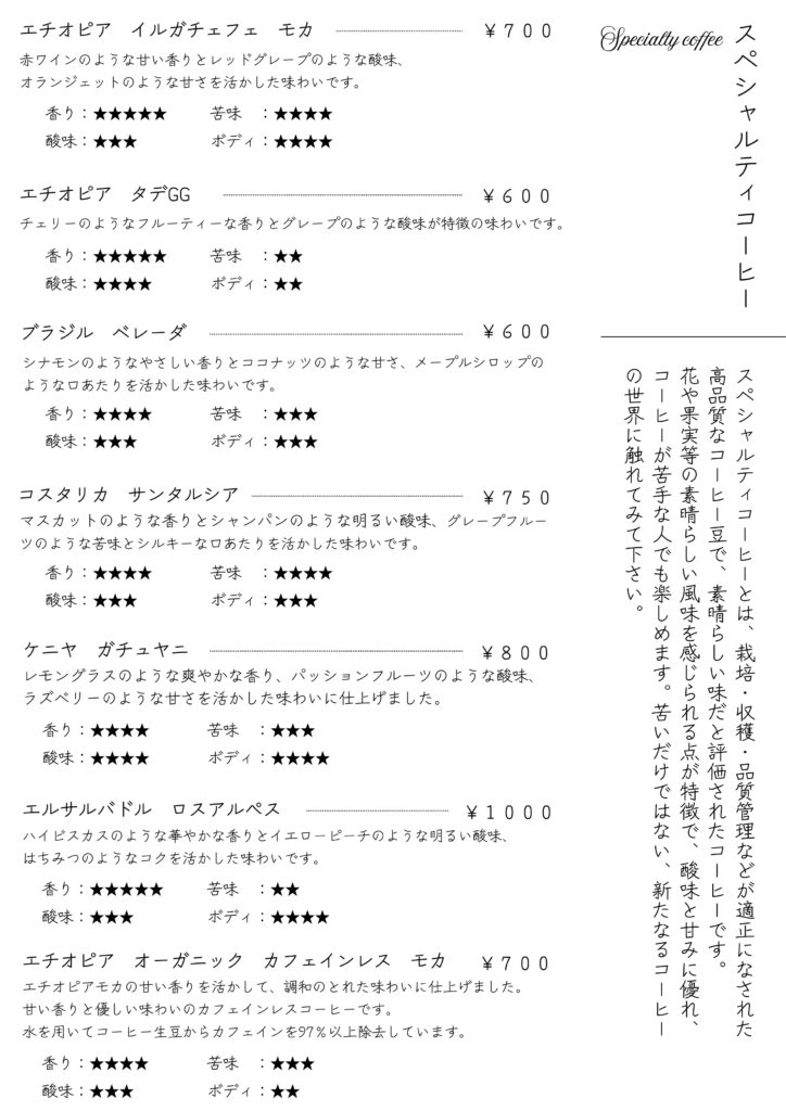 ※ドリンクはテイクアウトが可能です。一部ドリンク(シェケラート、エスプレッソ等)はカップに対して液体量が少なくなります。 ※メニューは予告なく変更する場合が御座います。